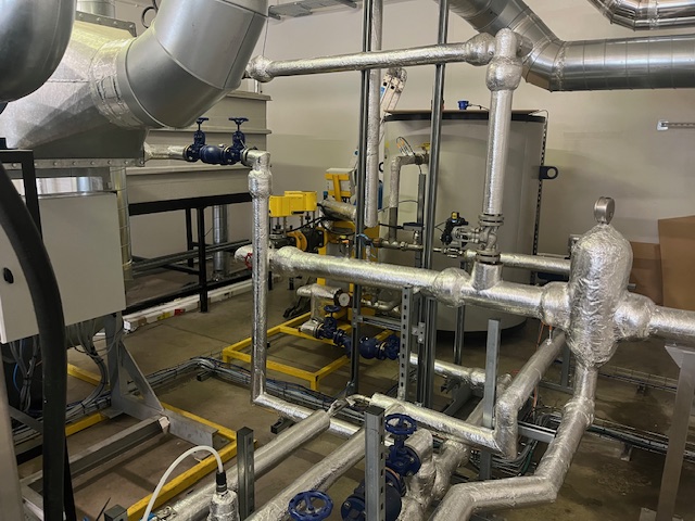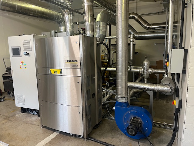 A plant room built for a cleaning project by us. The system uses steam to create high temperature water via heat exchanger. The steam is also used to create warm air for the drying process of the clean.