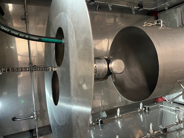 The high pressure spinner heads clean the internals and the spray bars around the cabinet do the externals. The spinner head manifold has a warm air duct fitted to dry the vessels.