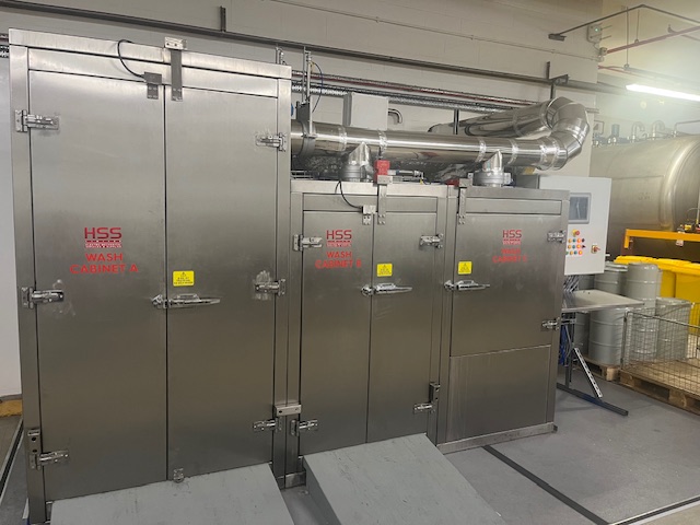 Three sizes of cleaning cabinet are used to clean different sizes of ingredients vessels. The process cleans the externals and the internals then drys the vessels to make sure that no moisture is present to cause contamination in the powders that are used in the vessels.